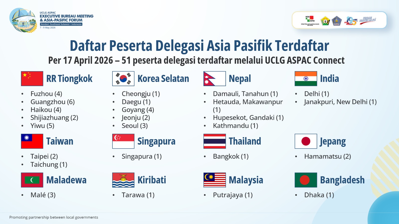 Data Sekretariat kegiatan mencatat, hingga 17 April 2026, total peserta yang telah terdaftar terdiri dari 36 delegasi Indonesia dan 51 delegasi internasional yang mendaftar melalui platform UCLG ASPAC Connect. Kehadiran puluhan delegasi lintas negara ini menjadi indikator kuat tingginya antusiasme terhadap forum yang mempertemukan para pemimpin daerah di kawasan Asia Pasifik tersebut.