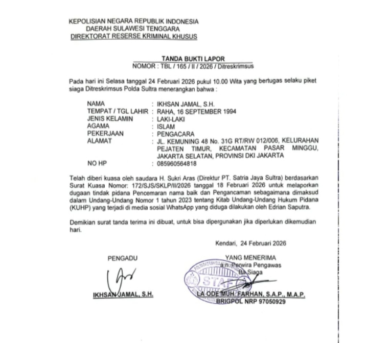 KENDARI, MITRANUSANTARA.ID – Upaya penegakan hukum atas dugaan pencemaran nama baik dan pengancaman resmi bergulir di Sulawesi Tenggara. Kuasa hukum Direktur Utama PT Satria Jaya Sultra, Ikhsan Jamal, S.H., melaporkan kasus tersebut ke Direktorat Reserse Kriminal Khusus (Ditreskrimsus) Polda Sulawesi Tenggara.
