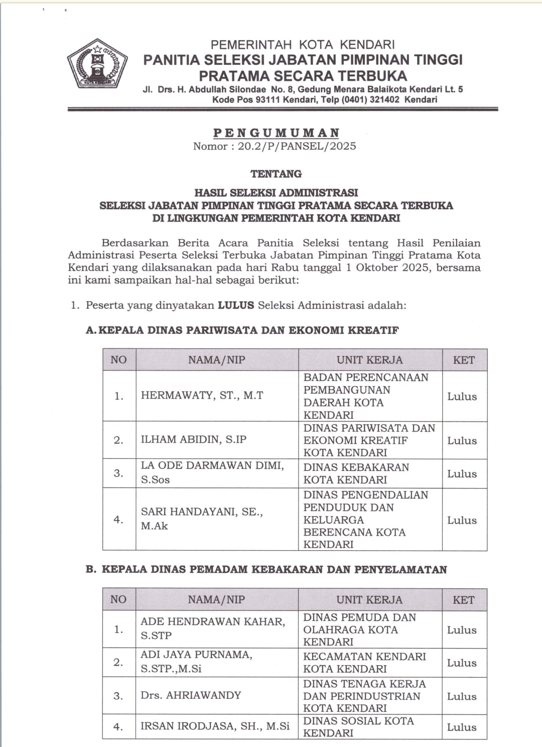 KENDARI, MITRANUSANTARA.ID – Panitia Seleksi (Pansel) Jabatan Pimpinan Tinggi (JPT) Pratama Pemerintah Kota Kendari resmi mengumumkan hasil seleksi administrasi. Pengumuman tersebut tertuang dalam Surat Nomor 20.2/P/PANSEL/2025 yang ditandatangani Sekretaris Daerah Kota Kendari selaku Ketua Pansel, Amir Hasan, pada Rabu (1/10/2025).