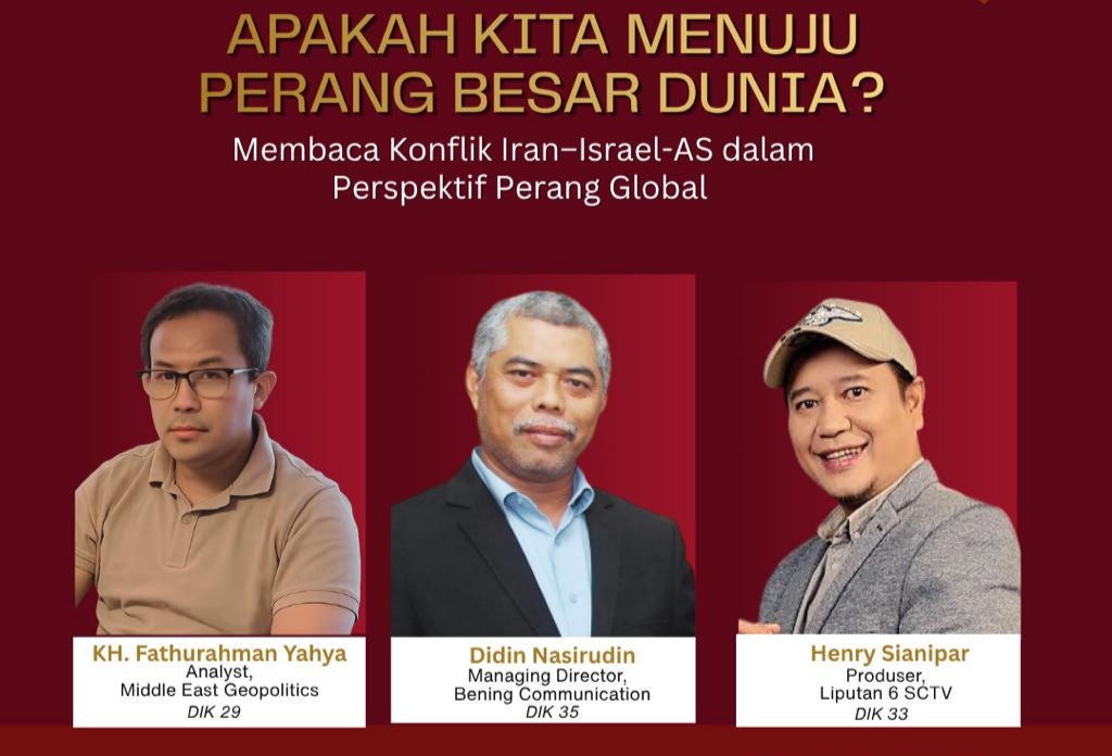 Diskusi ini menghadirkan tiga pakar dari berbagai perspektif untuk membedah eskalasi konflik di Timur Tengah yang kian kompleks dari latar belakang yang saling melengkapi, yakni KH. Fathurahman Yahya sebagai analis geopolitik Timur Tengah/DIK-29, Didin Nasirudin (praktisi komunikasi strategis/DIK 35), dan Henry Sianipar (DIK 33) sebagai produser media nasional. Dipandu Mochammad Husni (DIK 31), Vice President Corporate Communication PT Astra Agro Lestari Tbk.